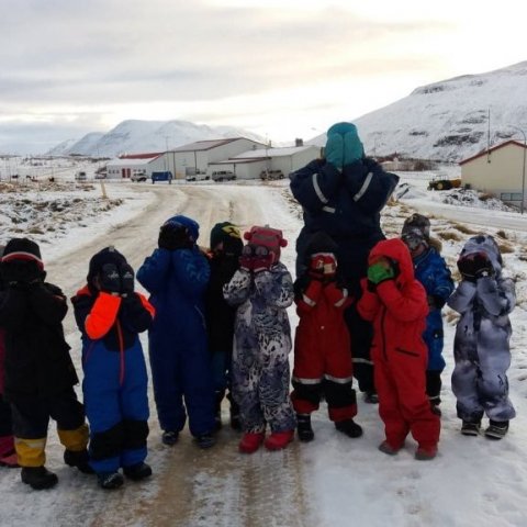 Undanfarna daga höfum við verið að læra um álfa og huldufólk sem er mjög skemmtilegt. Síðastliðinn föstudag fórum við í gönguferð að Grenjá eða rústum Árbakka með 1-5 bekk úr grunnskólanum. Síssa sagði okkur sögur sem gerðust á þessu svæði í gamla daga og sögur sem tengdust ákveðnum álfasteinum sem við skoðuðum. Áður en heim var haldið skildum við eftir tvær mandarínur handa álfunum :)